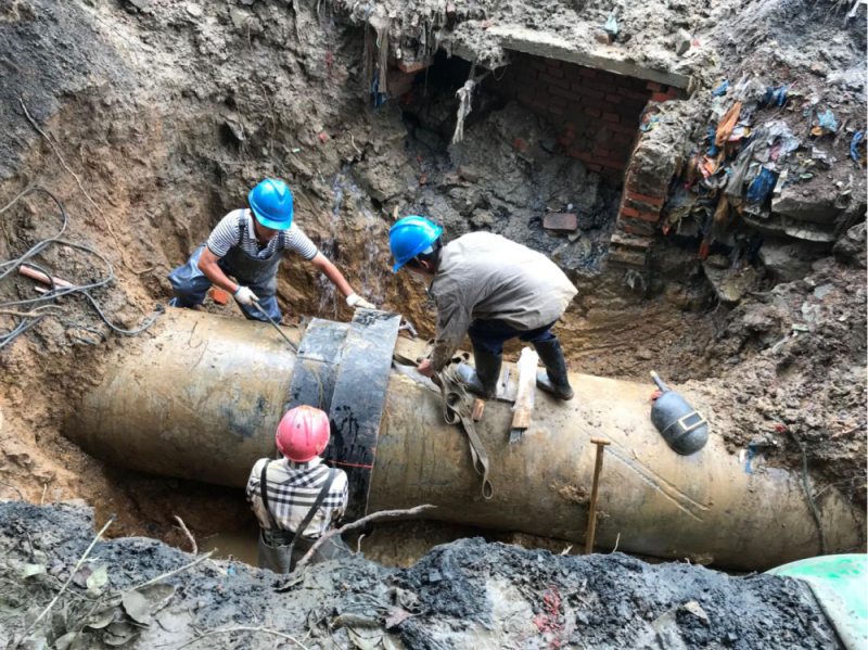 18日下午6點,DN800管道漏點終被挖出,原因是兩根水泥管道連接處經(jīng)過天長日久的熱脹冷縮而發(fā)生漏水。考慮到停水作業(yè)將會影響用戶的正常需求,在管道挖出后,搶修人員發(fā)揮分工協(xié)作的高效作風(fēng),一組進行人工清理操作坑底和管上的淤泥,一組負責(zé)備料,一組關(guān)閘調(diào)水。下午7點,材料到位,操作坑內(nèi)5名維修人員加緊手中動作,一刻不停進行管道清理、搶修節(jié)包裹、擰螺栓……19日凌晨,經(jīng)過14個小時的緊急搶修,DN800供水管道維修工作順利完成,主城區(qū)全面恢復(fù)正常供水。